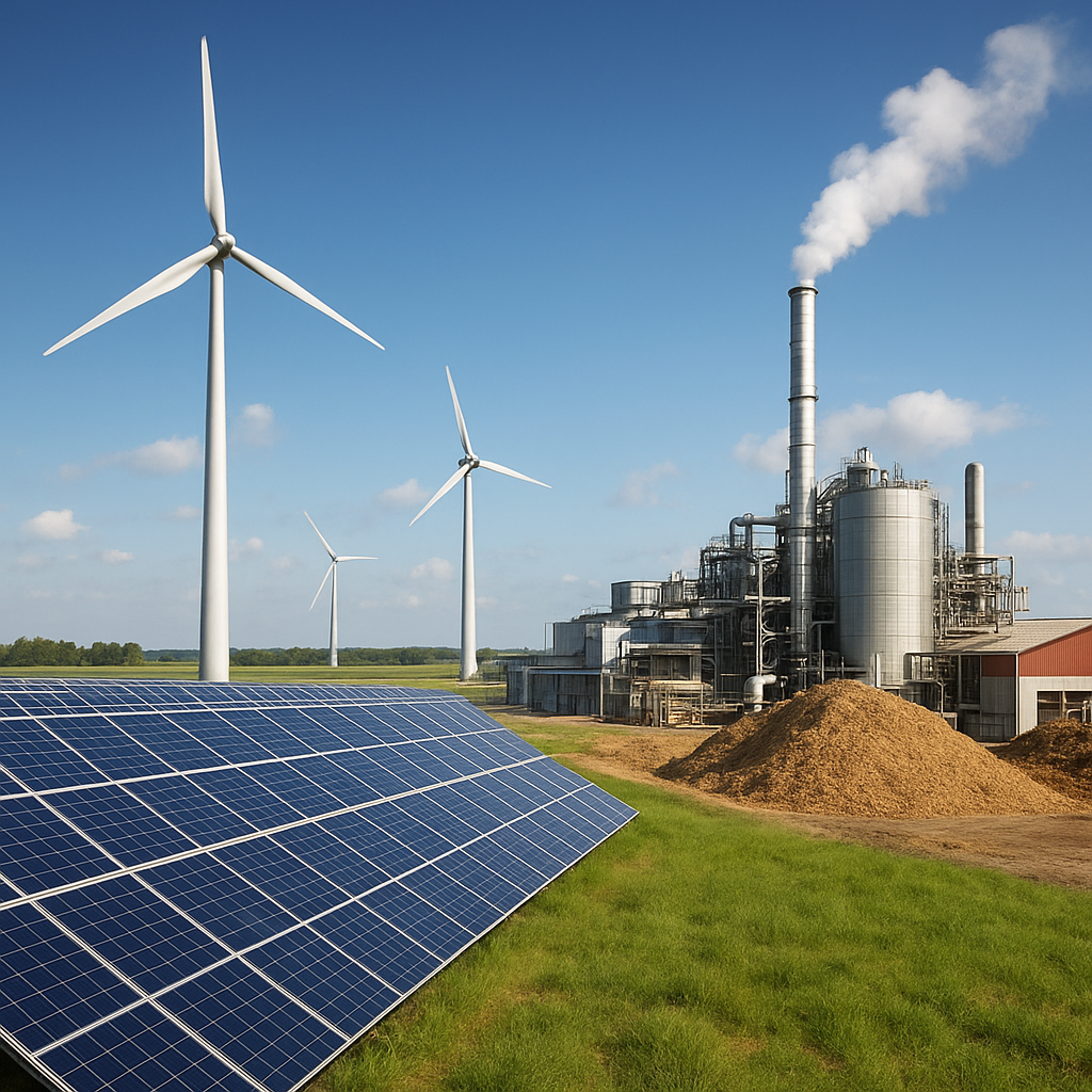 - Biomasa roślinna – uprawy energetyczne (np. trzcina cukrowa, miscanthus), odpady drzewne i pozostałości z gospodarki leśnej.